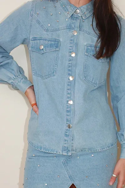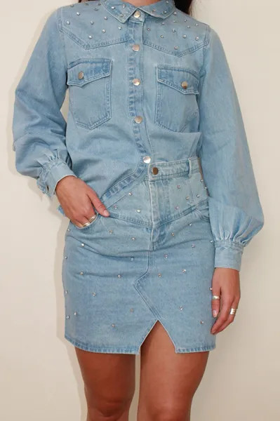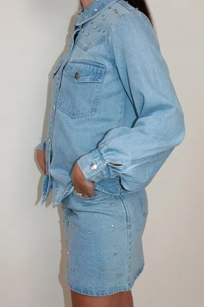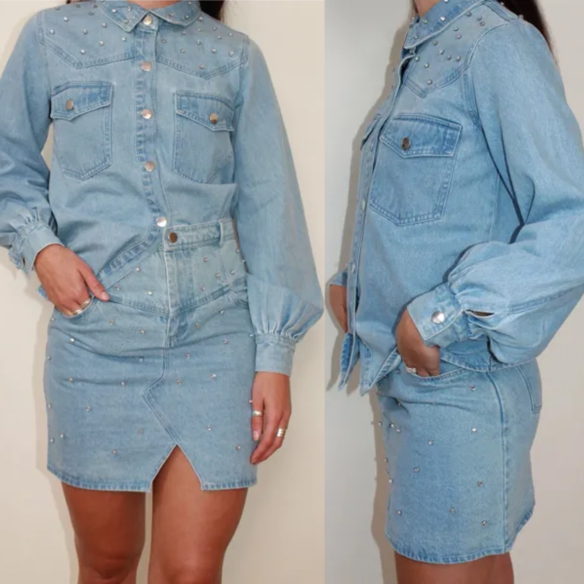 This two-piece Skirt set is very different. It has rhinestones on the top and the skirt. This set does not have much stretch.