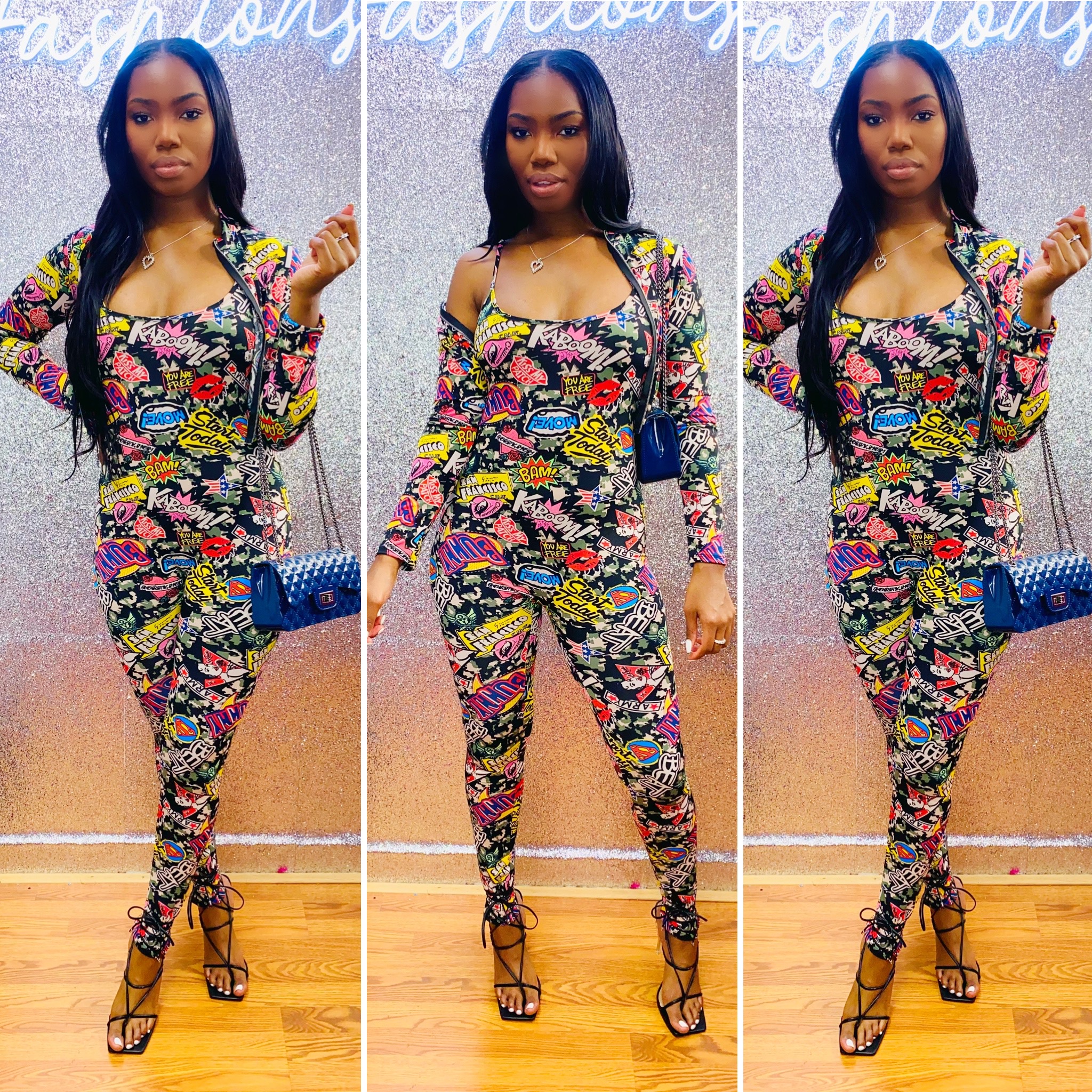 When you put this two piece on it's all fun and games. You can wear the jacket to give the jumpsuit a different vibe, This piece is true to size and it has an excellent stretch.