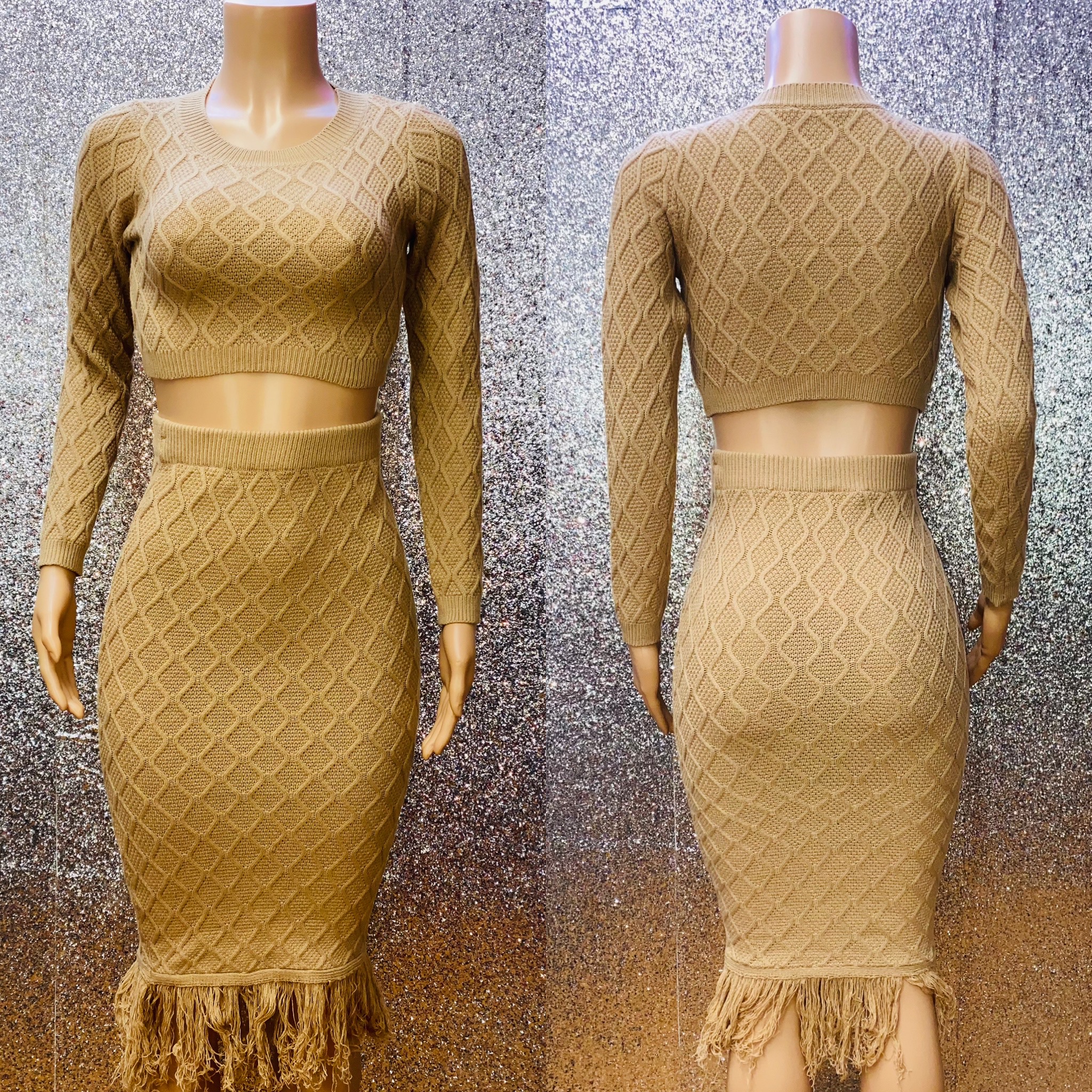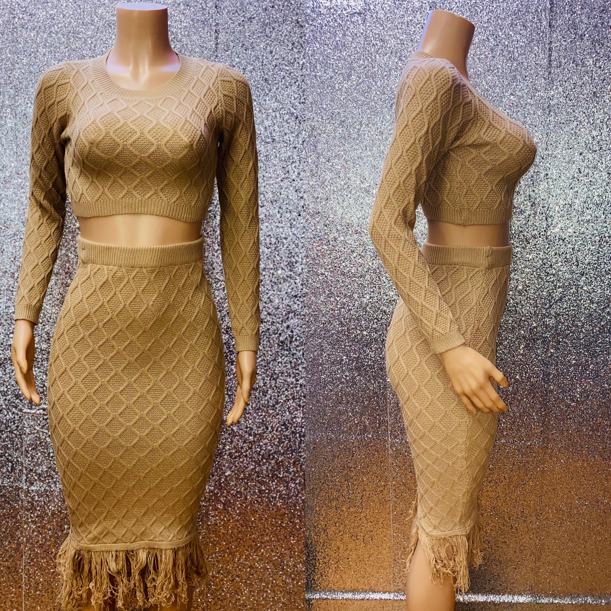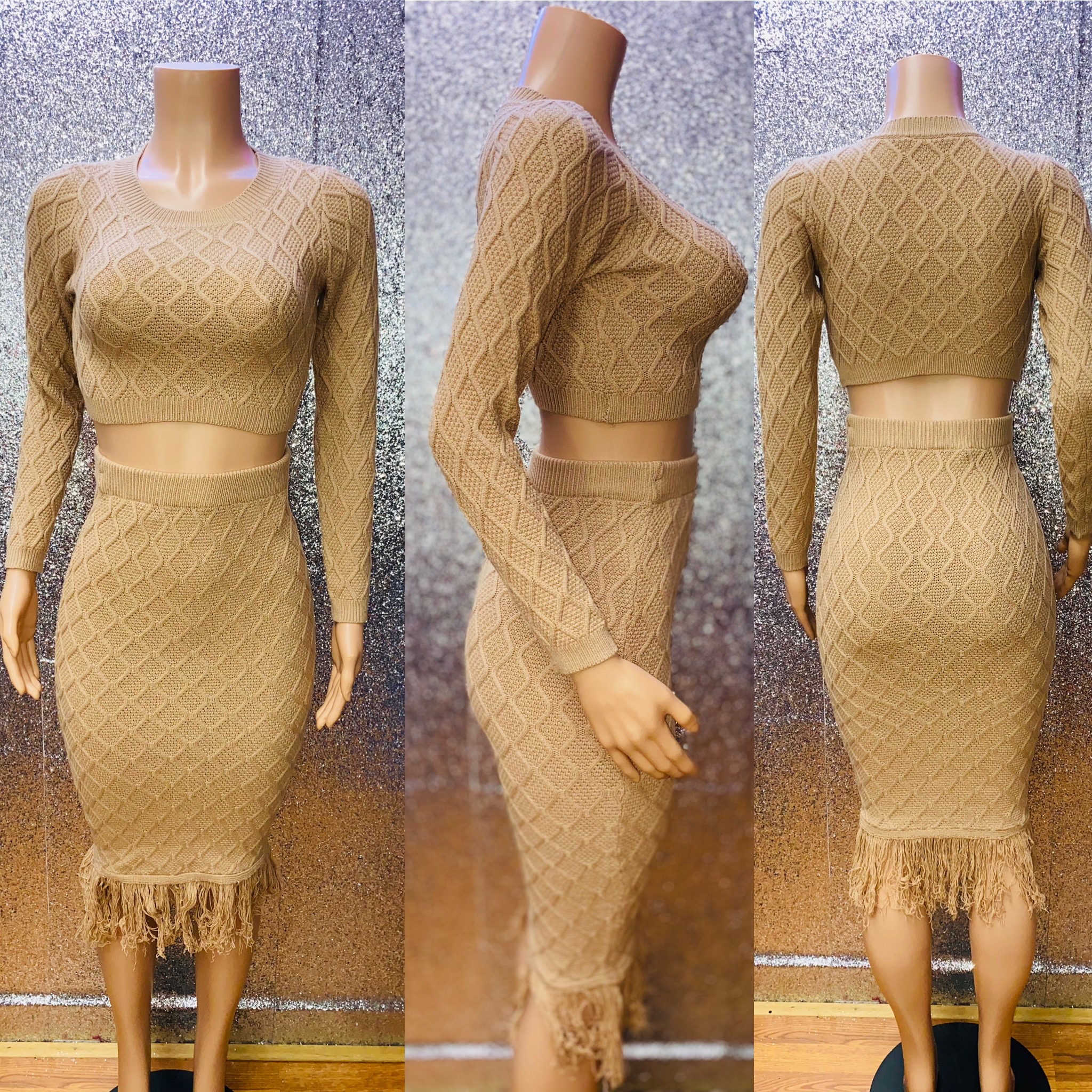 Product Description IN STORE 2-3 DAYS SHIPPING This knitted two piece set is very classy. It runs true to size and has some stretch.