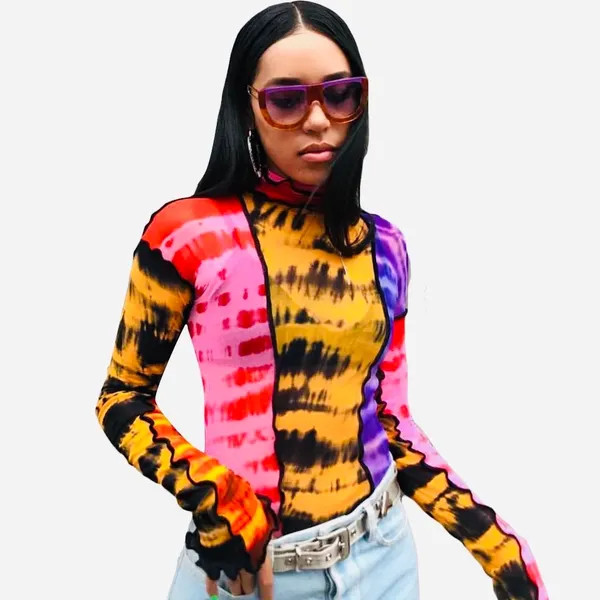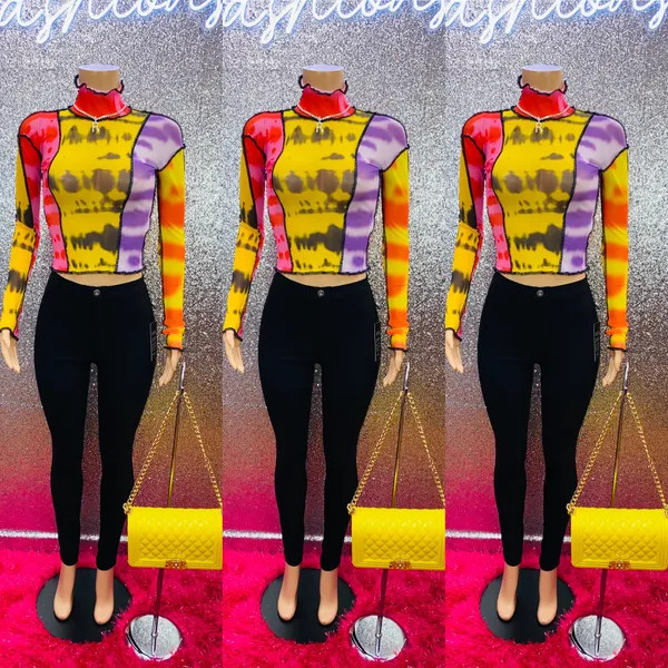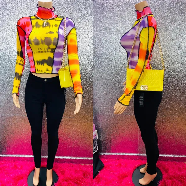 Ladies this vibrant mesh top will definitely stand out in a crowd. This piece runs true to size and has a stretch.